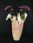 2009Deze vaas is handgebouwd van fijne witte klei met molochiet, ook de vijf paardenhoofden zijn allemaal hol van binnen. Afgewerkt met vijf lagen kristalglazuur, waarvan de laatste paarse effecten geeft. De vaas komt vanwege de hoogte nooit zo goed over op de foto. Hij is waterdicht en kan dus echt als vaas worden gebruikt.