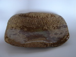 2010Deze handgevormde fruitschaal heeft een ingerolde decoratie. Het materiaal is terracotta Valentine klei, afgewerkt met een koper-ijzerglazuur. De schaal staat op drie poten en is gesigneerd.