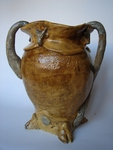 2011Handgebouwde vaas met stierenkopjes, staart en hoorn. Waterdicht; ijzerglazuur, 1140 graden.
