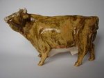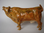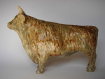 2010Deze loeiende stier is handgebouwd uit een menging van steengoedklei en porseleinklei. Hij is helemaal hol, van staart tot open neusgaten. Zijn achterste heeft een open spleet, zodat hij als spaarpot gebruikt kan worden