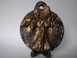 2012De keramiekwedstrijd van Kerameikon in Varazdin (Kroatië) in 2012 heeft als thema: jouw stad in mijn stad en de vraag hoe het is in de stad te leven. Voor mijn inzending heb ik het stadsleven opgesplitst in componenten zoals die in beide steden van belang zijn: kunst, sport, monumenten, paarden, keramiek, beschaving en liefde. Elke component wordt gesymboliseerd door realistische vormen. De medaillons zijn met de hand gemaakt uit een menging van steengoedklei en porseleinklei en afgewerkt met een bronsglazuur.
